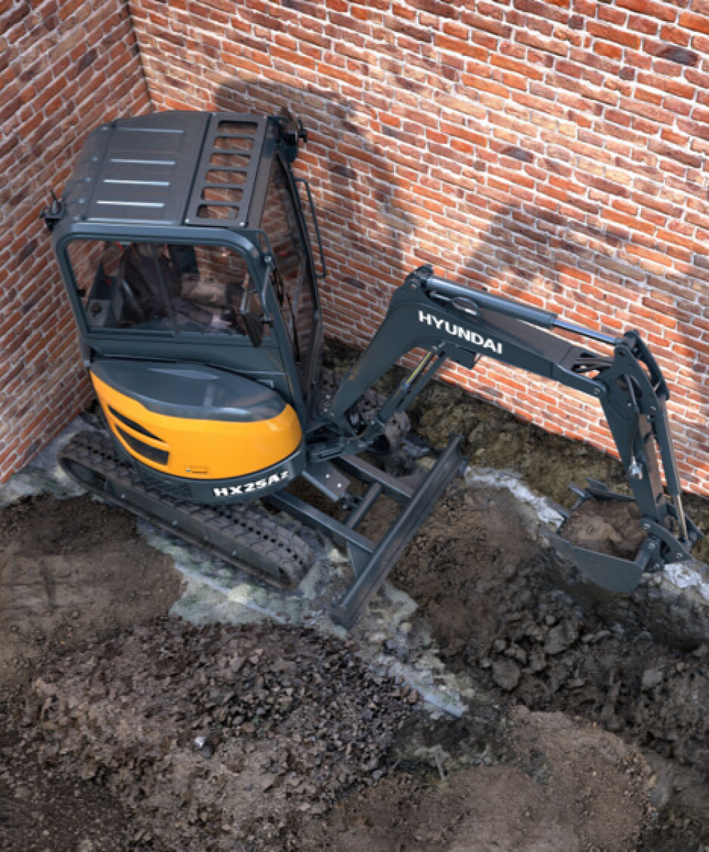 Med et kompakt design uden bagende-sving og en lav vægt på 2610 kg kan HX25A Z nemt transporteres på enhver lille trailer sammen med en hurtigkobling og 3 skovle uden at overskride den lovmæssige vægtgrænse.