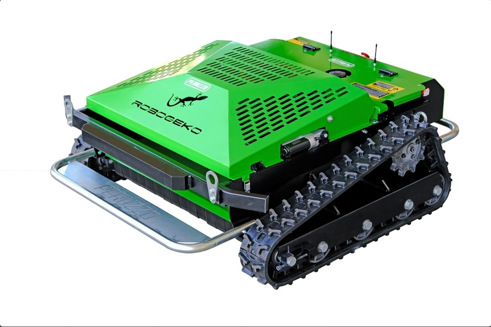 | Beskrivelse | Robogeko bæltebundne fjernstyrede plæneklipper, en helt ny innovation inden for professionelle plæneklippere, er udstyret med en 16 HK Loncin benzinmotor, der gør det muligt at køre på skråninger op til 30° og effektivt klippe græs op til 1 meter højt. |